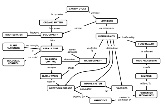 Similar in looks but different in meaning from mind maps, that’s how you could describe a concept map. Visually speaking, at first glance concept maps look quite similar to mind maps. However, there are some major differences. Concept maps can connect multiple ideas in one visual, not just one main concept like mind maps do. Additionally, concept maps don’t follow the tree-like, radial structure of a mind map, but rather use a more varied pattern. A mind map shows the branches of a knowledge-tree, while a concept map shows the roots, which are interconnected and build up the rhizomes. Sometimes, concept maps follow a downward structure. Others might prefer a less directed approach, with branches leading everywhere. In that sense, concept maps are much more free than are mind maps.  The information in a concept map is depicted with information bubbles or boxes that are labeled. You might also use certain phrases to make clear what kind of connection there is between the boxes.