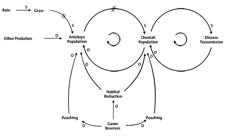 A key element that system diagrams commonly include are ‘feedback loops’. These feedback loops, like a vicious circle, might either reinforce (‘reinforcing loop’) or reduce the impact (‘balancing loop’). Such loops are displayed by circle-like shapes in which one variable affects the other. Feedback loops are key to the creation of system diagrams. We might even choose to display the delay of a feedback loop by slashing the line, something which is not possible with other mapping styles such as concept maps.